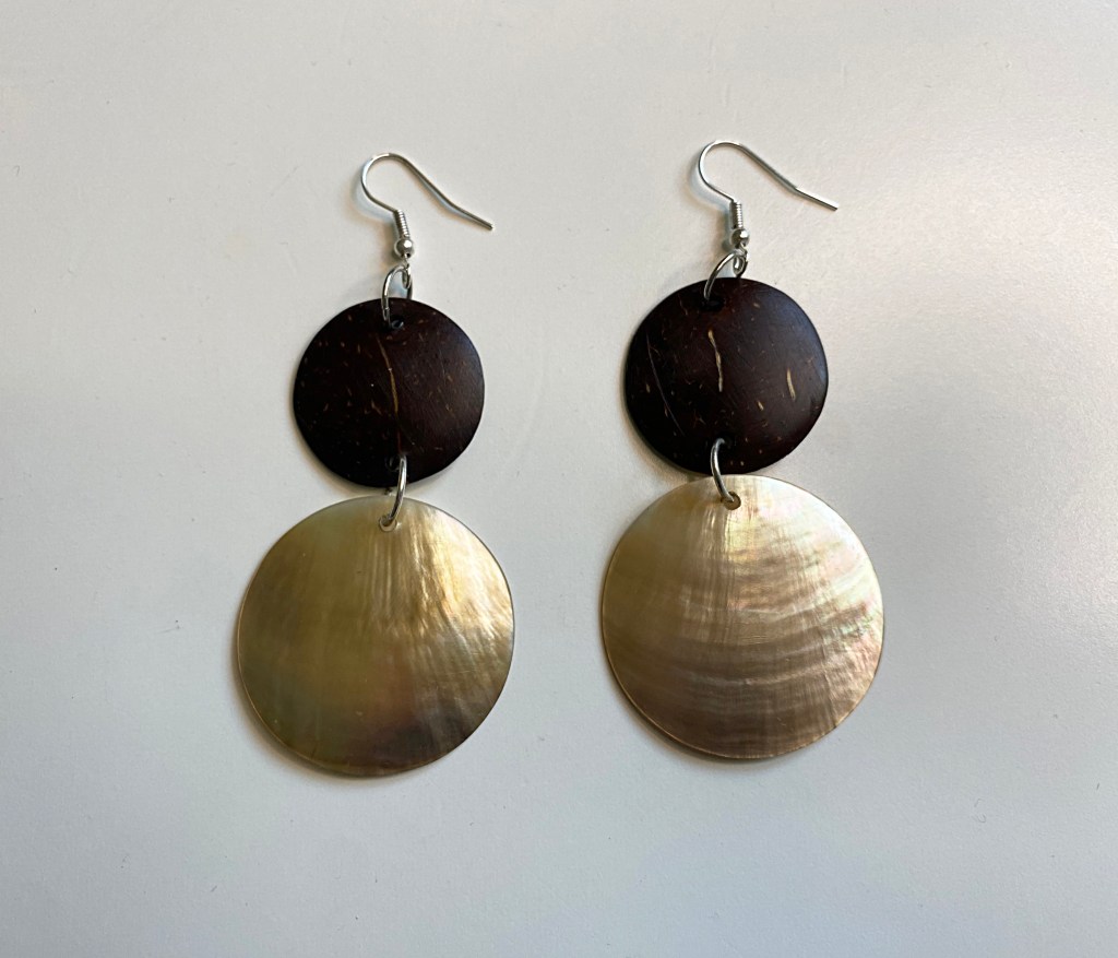 Hand made jewellery from locally farmed Mother of Pearl and Coconut. Hooks and rings in stainless steel. Produced by 18 women in the village of Bweleo in Zanzibar has made the womens collective Ukweli ni Njia Safi.